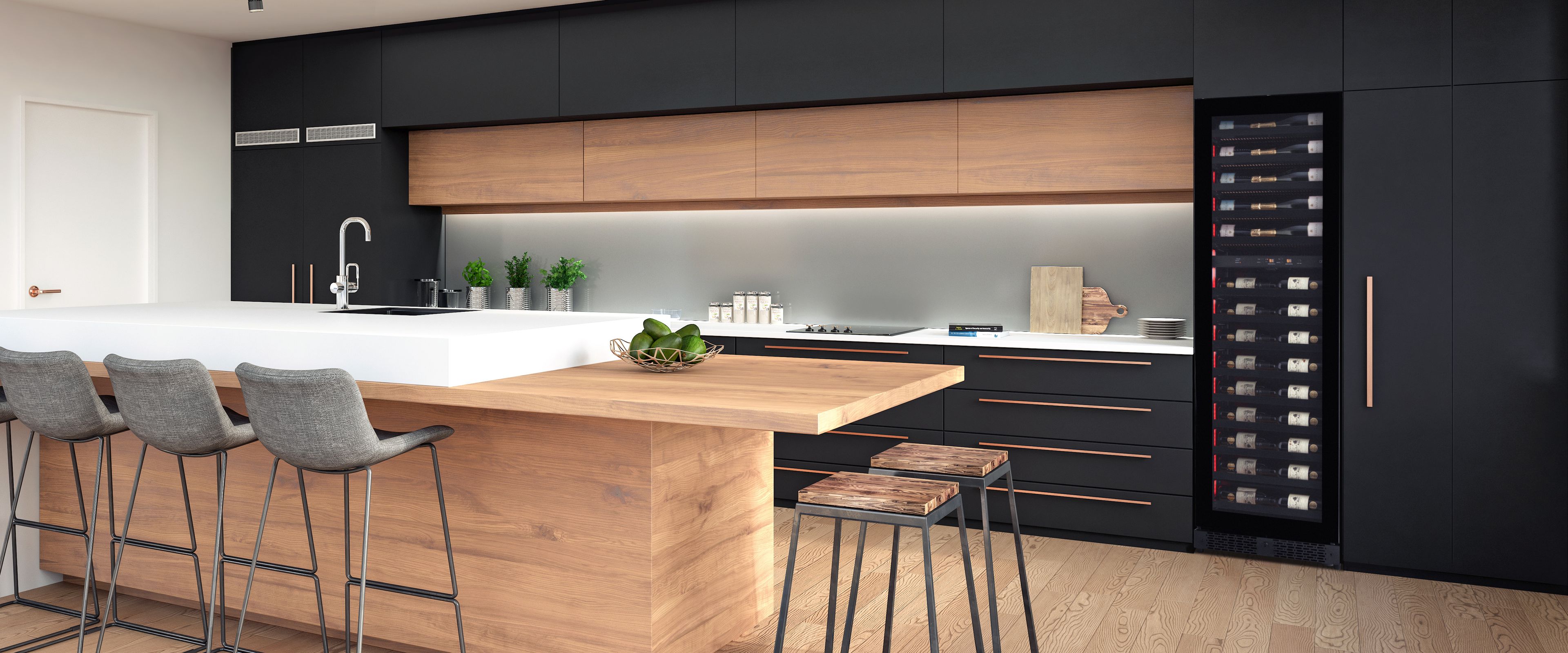 Una vinoteca integrada está diseñada para integrarse en una unidad de cocina existente, lo cual es una solución muy atractiva en una cocina moderna. La puerta de la vinoteca tiene el mismo ancho que el módulo de cocina para cubrir los lados del mueble de cocina, mientras que el resto de la vinoteca es más estrecho para que se ajuste al módulo de cocina existente. Al igual que con los otros dos tipos de vinotecas, es importante que el aire caliente pueda escapar de la vinoteca integrada. Es particularmente importante que el aire pueda escapar por la parte trasera y hacia arriba para un paso libre en la parte superior del armario. Asegúrate también de tener una entrada de aire en la parte inferior de tu armario de cocina, por ejemplo, instalando una rejilla.